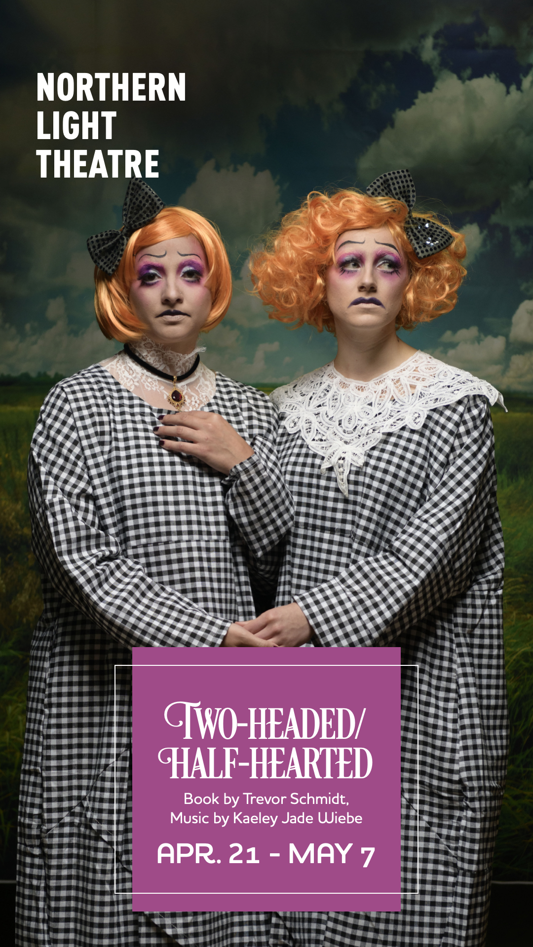 Two-Headed/Half Hearted: a musical song cycle that details the lives of Juno and Venus Hollis, conjoined twins and daughters of Jupiter Hollis and his mermaid wife, Ida Mae. A prairie-gothic tale of isolation, mythology, family and yearning sung by two musical narrators, Two-Headed/Half-Hearted interweaves stories and songs of the twins’ birth, life and death with that of other famous conjoined twins through history. With book by Trevor Schmidt and music by Kaeley Jade Wiebe, Two-Headed/Half-Hearted asks the question: Can one heart be torn apart and survive?